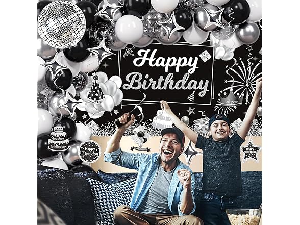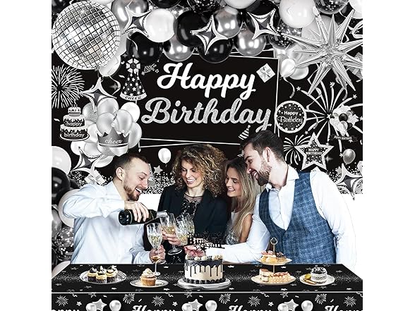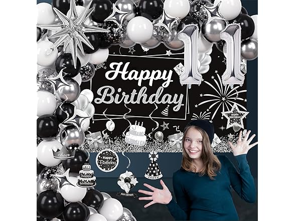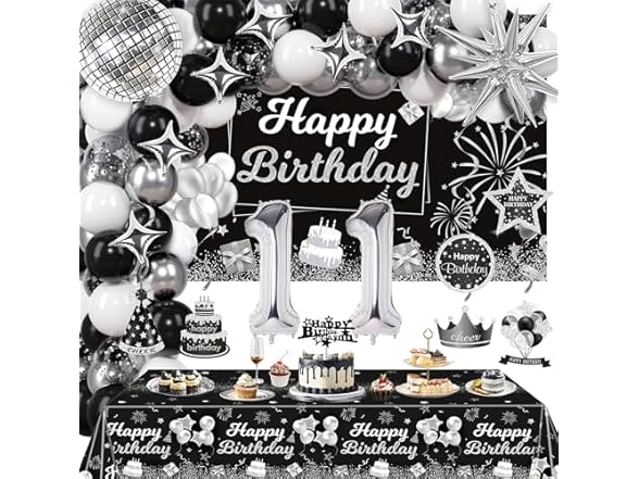 Miidenks 11th Birthday Decorations Set for Boy Girl,Black Silver Happy 11 Birthday Party Supplies with Birthday Backdrop Banner Birthday Tablecloth 11 Number Balloons for Her Him