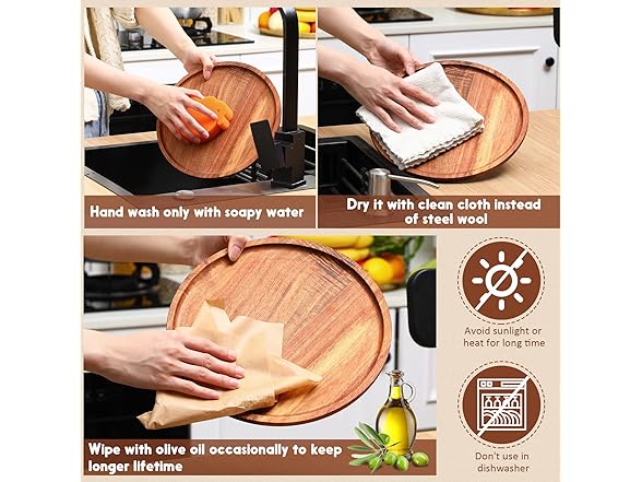 - Easy to Clean: our round wooden trays are delicately crafted with natural acacia wood and the wood is sanded smooth and can protect the wood from moisture, which makes it easy to clean; Wash with soap and warm water and hand dry with a clean cloth, occasionally rub with olive oil for longer service time, but please do not place in the microwave