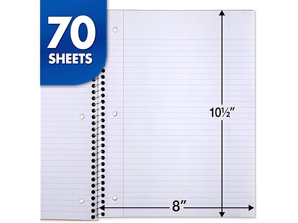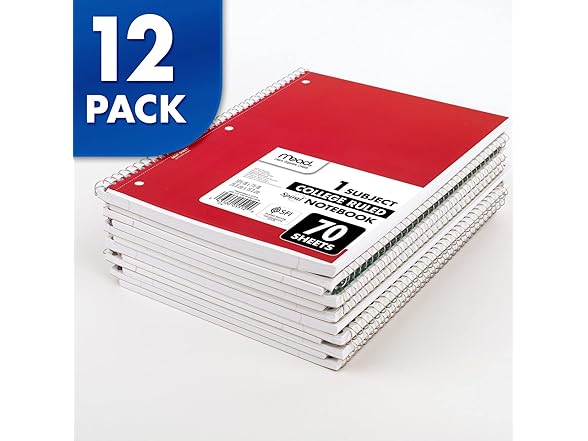 Mead Spiral Notebooks, 12 Pack, 1-Subject, College Ruled Paper, 10-1/2" x 8", 70 Sheets per Notebook, Color Will Vary (73703)
