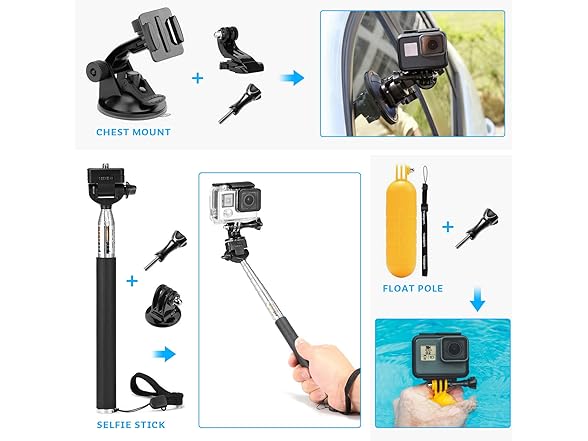 - Adjustable chest strap mount for AKASO action camera, capture wonderful video and photo at different angle.Perfect for skiing, cycling, canoe and more other sports activities use.Floating Handle Grip+Mount Adapter, Floating mount is easy to use to keep camera floating. Bright yellow in the water makes it can easily be found.
