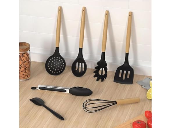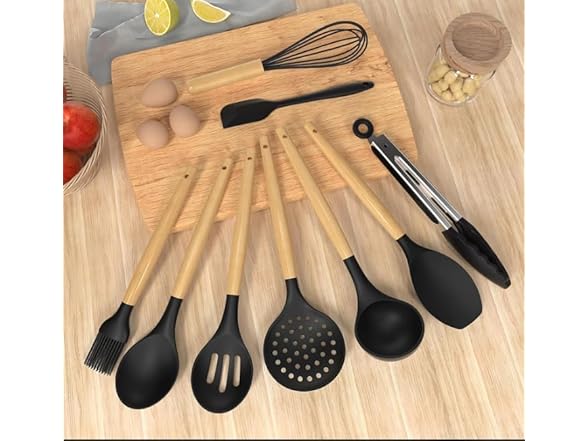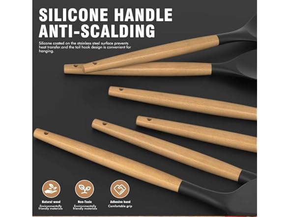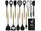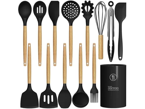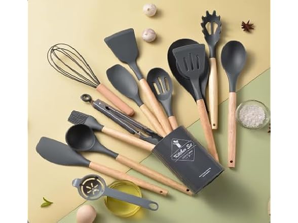 14 Pcs Silicone Cooking Utensils Kitchen Utensil Set - 446°F Heat Resistant,Turner Tongs, Spatula, Spoon, Brush, Whisk, Wooden Handle Gray Gadgets with Holder for Nonstick Cookware