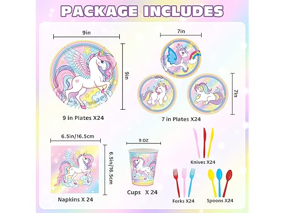 - 【Unicorn Party Decorations】:Our unicorn party themed set includes everything you need to throw an unforgettable unicorn rainbow theme birthday party. You'll receive 24 x 9 in plates, 24 x 7 in plates, 24 x 6.5 in napkins, 24 x cups,24 x forks, 24 xKnife,24 xSpoon.