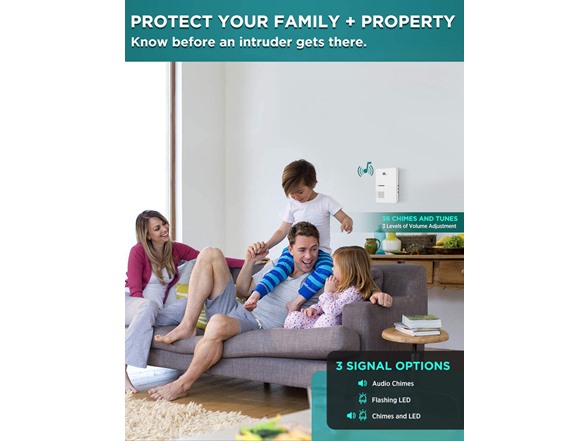 - 3 Alert Options & 36 Chimes to Choose From - Select one of 3 ways of being alerted (Sound/LED Flash/Sound and LED Flash) and 3 volume levels from 25-80dB. Also select from 36 chimes and doorbell sounds. Be alerted to visitors, scare off unwanted intruders, or even know when your children have accessed restricted areas.