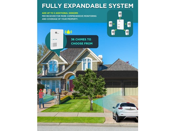 - Fully Expandable System - Our wireless driveway alarm sensor is fully expandable. Simply place your motion sensor/or multiple sensors (expandable up to 5 sensors) anywhere on your property and when a person, vehicle, or large animal moves within 24 feet of the sensor’s angled eye, a signal will be sent to the receiver that will chime in your home just like a long-range doorbell.