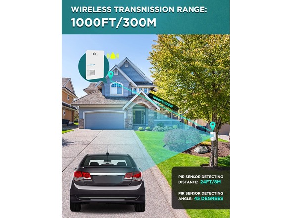 - Long Distance Wireless - Communication range up to 1000ft/300M from each sensor to the receiver. Cars, people and animals can be detected within 24ft/8M of each sensor’s angled eye. Think of this system as your long-range doorbell.