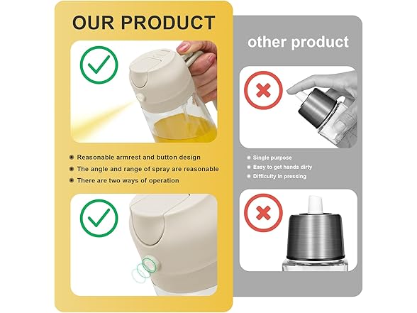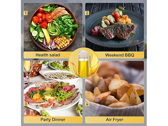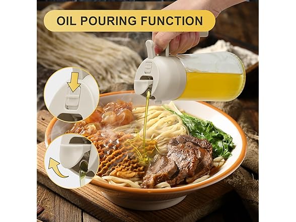- Multi-purpose oil spray bottle: This product provides spray and pour oil delivery methods, allowing you to choose between faster oil delivery or more even oil delivery when choosing different cooking methods. Allows you to save kitchen space and cooking time.