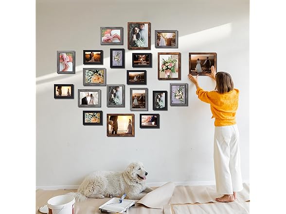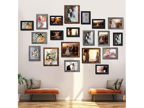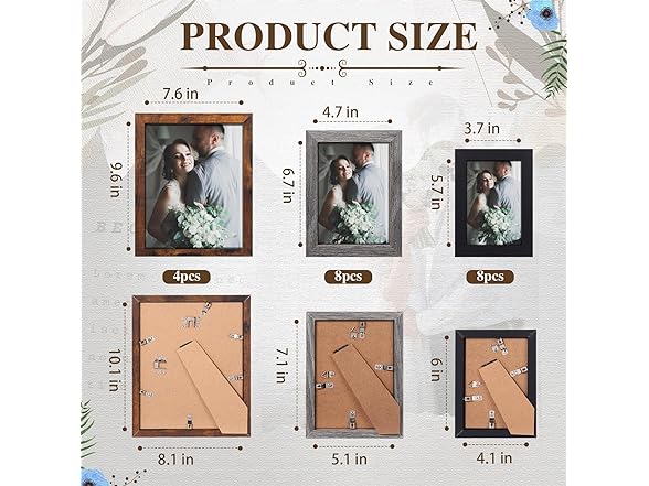 - Bundle of Artistry: the gallery wall frame set containing 20 rustic picture frames collage; This set includes 4 pcs wood grain brown 8x10 in frames, 8 pcs 5x7 in gray frames, and 8 pcs 4x6 in black frames, presenting a diverse range of sizes to fit; Simply peel off the protective film on both sides of the acrylic to let your memories shine through