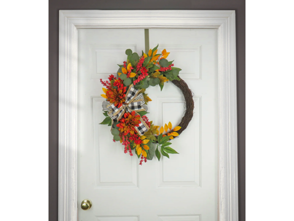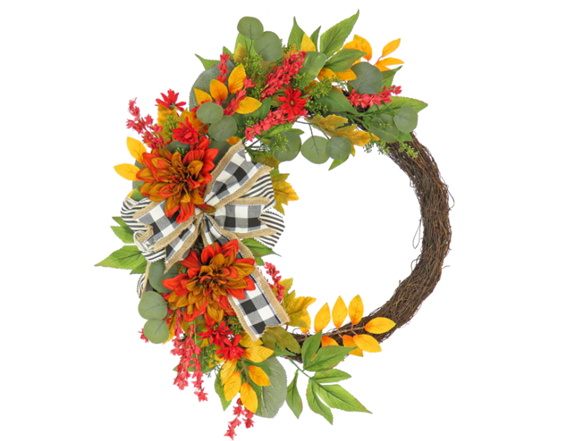 National Tree Company 24" Harvest Decoration- Wreath with Twig, Dahlia, Eucalyptus and Bow- Pack 1
