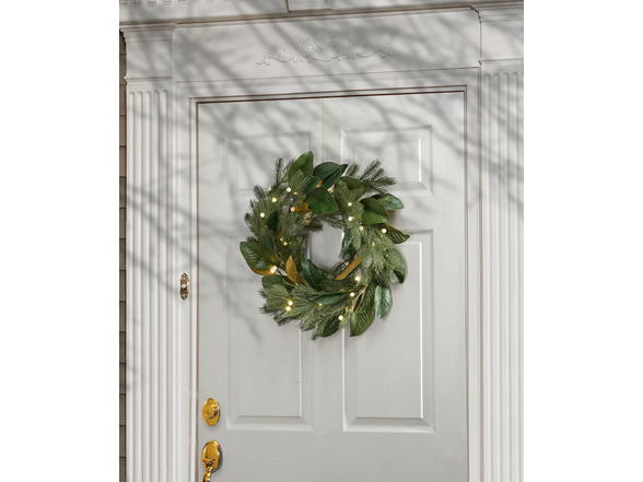 This holiday wreath features a mixture of wide magnolia leaves and soft pine branches swirling around a sturdy wire ring base. It is pre-lit with 35 battery operated warm white “berry" LED lights that are energy efficient and long lasting. Included is an option for 6 hours ON/18 hours OFF timed operation. Also included is a convenient handheld remote to control the lights. This wreath can be displayed on doors, walls, and windows in indoor or covered outdoor locations.