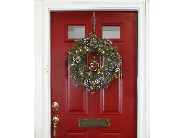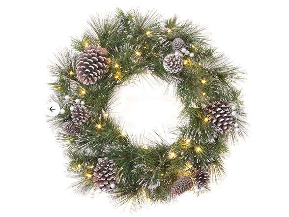 This attractive wreath features a mixture of evergreen and bristle branch tips trimmed with glitter, snow-dusted pinecones and white berries. It is pre-strung with 50 battery-operated warm white LED lights that are energy-efficient and long lasting.