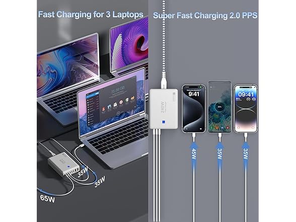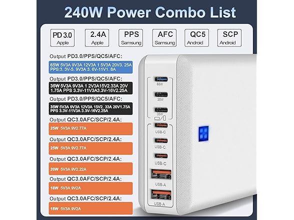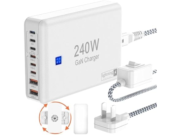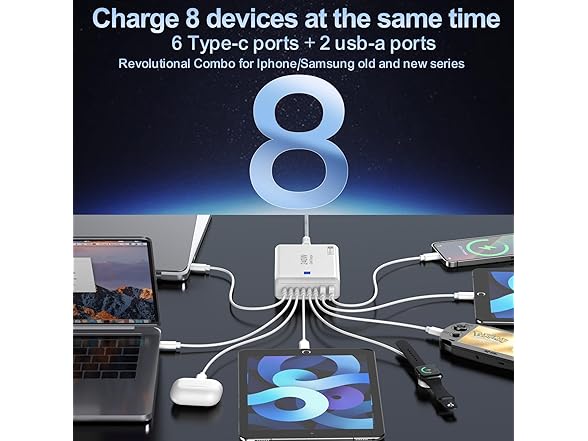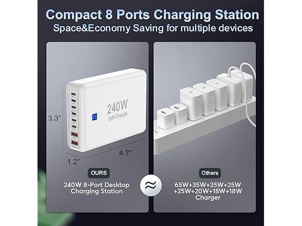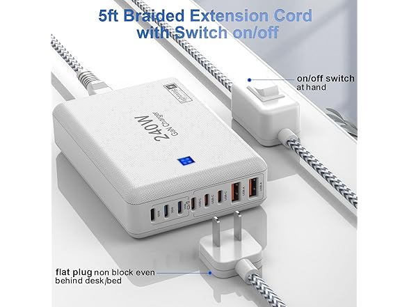 240W Fast Charging Blocks, 8-Port Charging Station for iPhone/Ipad/MacBook, 6C2A PD GaN Charger Box, USB Tower Hub 5ft Braided Power Cord with On/Off Switch, Flat Plug, Travel Essentials