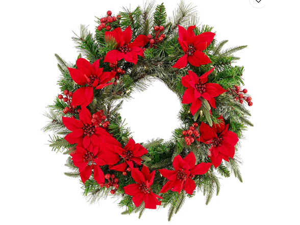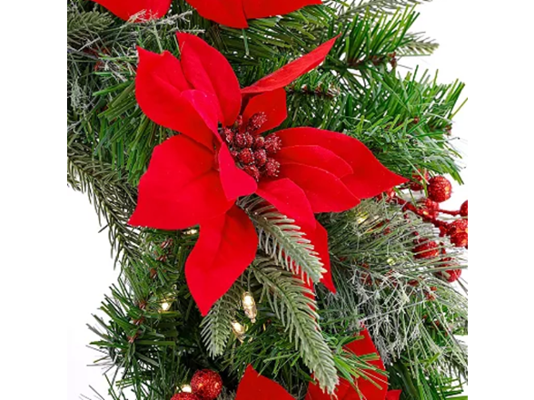 National Tree Company 26" Feel Real® Colonial Wreath with 10 Red Poinsettia, 10 Red Berries & 70 Warm White Battery Operated LED Lights w/Timer-BAT