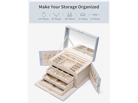 - High Capacity - Vlando jewelry organizer box has 3 drawers for small accessory, 2 retractable necklace boards, 6 earing studs boards, and 14 ring roll. DIY storage partitions make your jewelry all covered in the box.