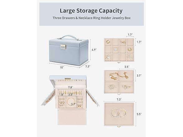 - Travel Portable - The compact size and carrying handle make this jewelry box organizer ideal for traveling. You can bring a variety of jewelry accessories to make your look different for every day. Dimensions: 10x 7.5 x7.1 inch.