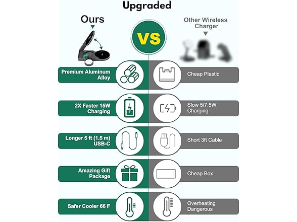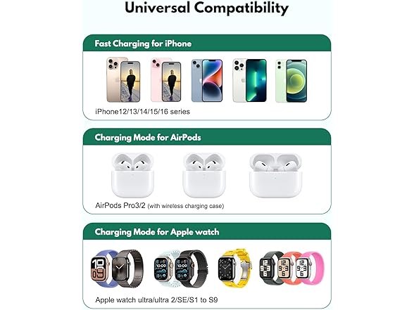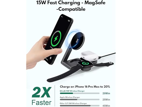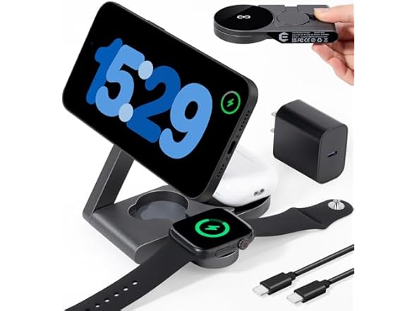- ⚡ 3-in-1 Charging for iPhone, Apple Watch & AirPods Simplify your desk setup with a space-saving wireless charging station that powers three Apple devices simultaneously – iPhone, Apple Watch, and AirPods. Enjoy tangle-free charging with clearly marked magnetic alignment zones for each device.