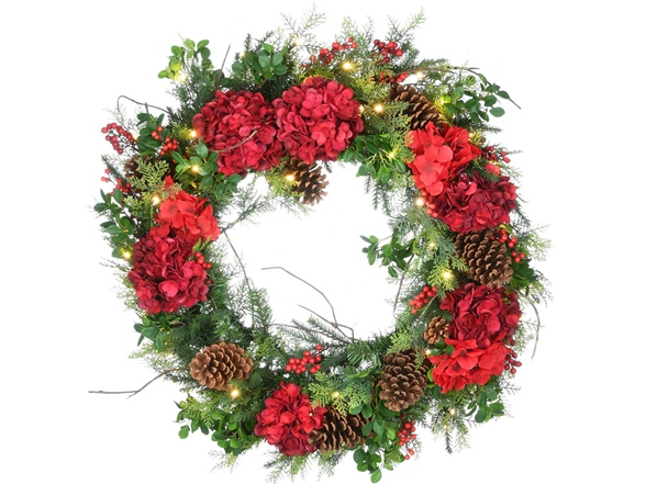 This Vienna Waltz decorated evergreen wreath features bright red hydrangea flower blooms. It is trimmed with leafy greens, cedar tips, pinecones and red berries for added seasonal appeal. It is pre-lit with 50 battery-operated warm white LED lights that are energy-efficent with a integrated 6 hours ON/18 hours OFF timer. Display this wreath on a door, wall or window in indoor or covered outdoor locations.