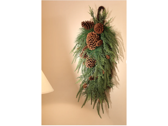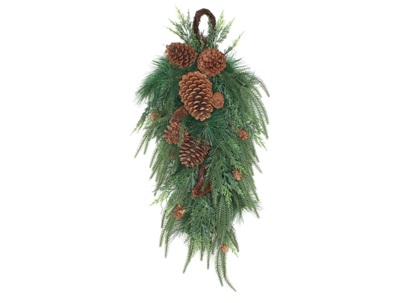 This teardrop features a mix of evergreen and bristle branches cascading from a woven branch base with top loop. It is trimmed with soft cypress tips and assorted pinecones for added natural appeal. Display this unique holiday-themed decoration on door, w