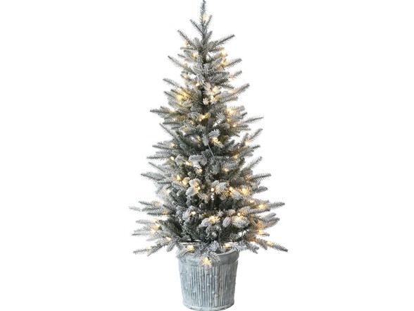 The Snowy Alpine Fir entrance tree features branches dusted with the look of freshly fallen snow. Seated in a white bamboo metal base, it is pre-lit with 100 warm white LED lights that are long lasting and energy efficient. Display this festive decoration in any indoor or covered outdoor location.