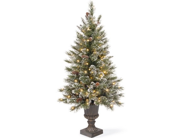 National Tree Company 4' Glittery Bristle® Pine Entrance Tree in Dark Bronze Plastic Urn with 14 White Tipped Cones & 100 Multi Twinkly™ Lights-UL