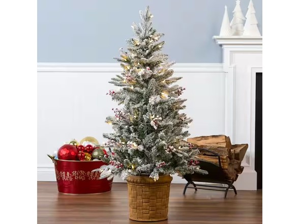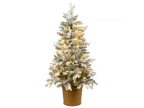 National Tree Company 4' Feel Real® Snowy Poechmann Fir Hinged Entrance Tree with Red Berries, Natural Pinecones & 70 Warm White LED Lights- UL/CUL