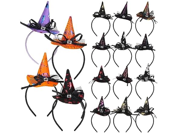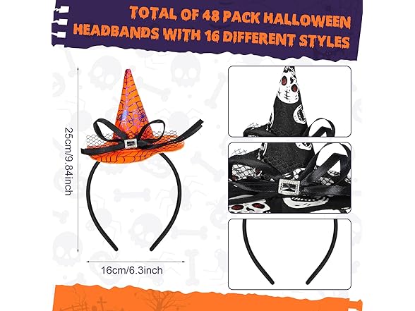 - Total Quantity: you will receive a total of 48 pieces of witch hat headbands in 16 different styles, each style for 3 pieces, they are designed with many Halloween elements, cute and eye catching, you can use them to warm up your parties, and you will stand out from the crowd