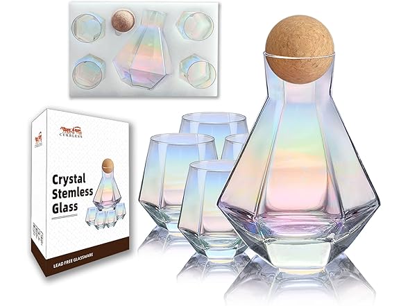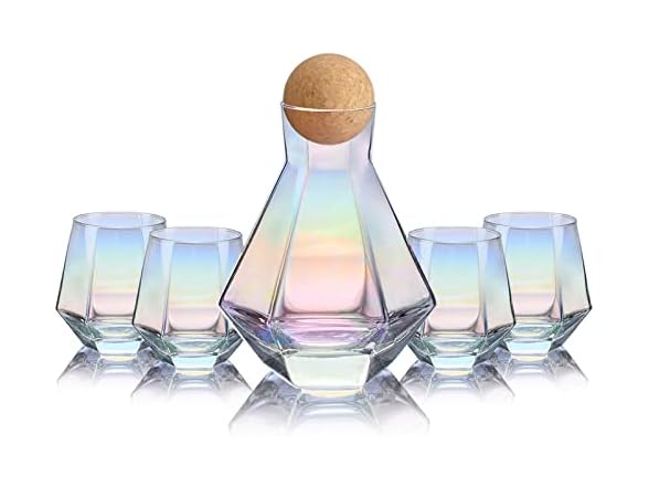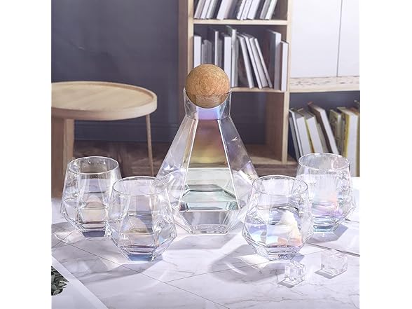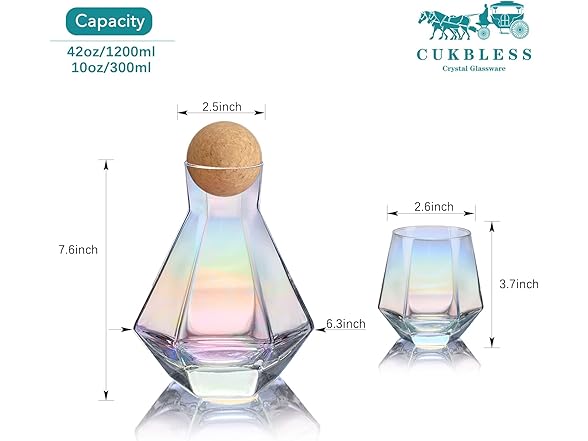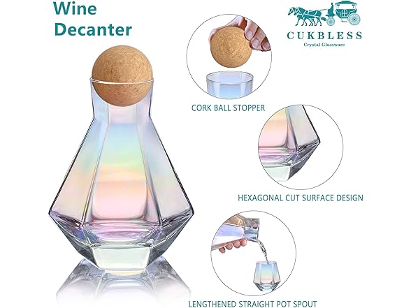 • COMPLETE DECANTER SET: Cork balls stopper keeps your wine safe from dust or bugs in an outdoor setting, and a 42-ounce decanter and four 10-ounce diamond iridescent wine glasses are available for all your drinking needs with friends