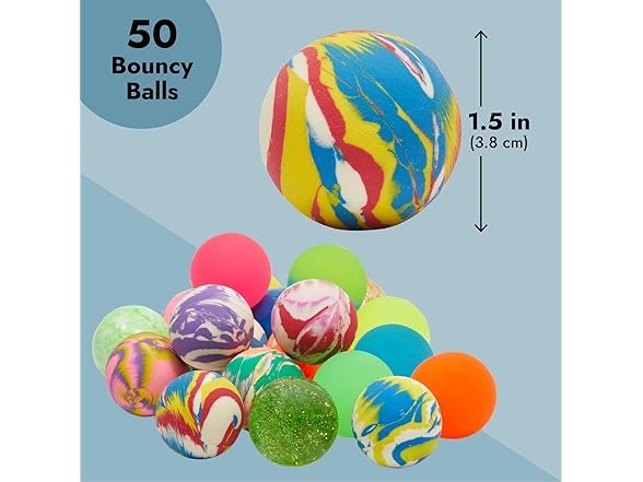 - Contents and Specifications: In this bulk pack of super bouncy balls, you will receive 50 large bouncy balls for gumball machines and goodie bags. Suitable for kids aged 5 and above; each ball measures 1.5 inches (38mm) in diameter providing an abundance of options for goodie bags