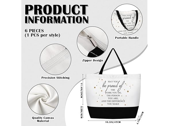 - Shareable Package: the package that you will receive includes 6 pieces of coworker inspirational tote bags in 6 styles, each style has 1 piece, each piece is designed with a zipper, diverse styles and sufficient quantities that can meet gifting needs easily