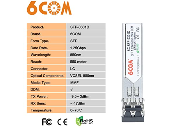 6COM Gigabit SFP Transceiver, Multi-Mode Mini-GBIC Module for Juniper SFP-1GE-SX/JX-SFP-1GE-SX/QFX-SFP-1GE-SX (DDM, 850nm, 550m)