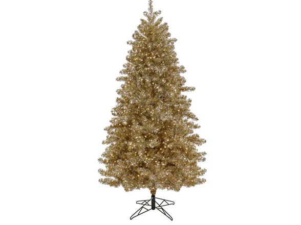 Bring a whole new dimension to your holiday decorating with this evergreen tree featuring sparkling metallic branch tips. This thick, full-bodied tree is strung with 1250 warm white LED Infinity Lights which are micro-LED bulbs built right into the light strings. This design allows for an increased volume of lights and cleaner overall look that provides a distinctly elegant result. Three-section, hinged branch construction makes assembly quick and easy. Sturdy folding metal tree stand is and lights ON/OFF footswitch included.
