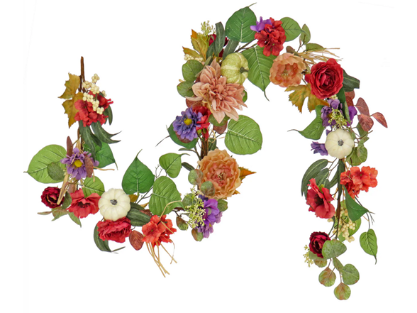 This garland features an assortment of colorful flower blooms flowing from a flexible vine base. A background of assorted leafy greens and eucalyptus stems add natural appeal. Scattered among the flowers are mini pumpkins to add a seasonal flavor. Display
