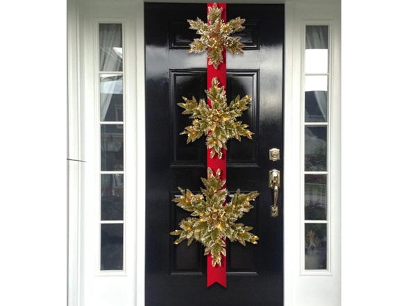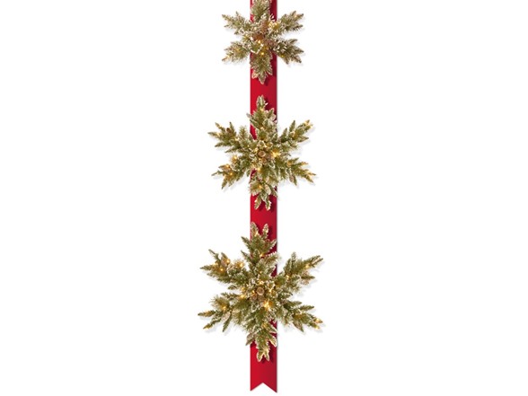 This festive door decoration features a 77 inch long red ribbon holding three Glittery Bristle Pine Snowflakes in 18in., 22in. and 26in. diameters. Each snowflake is trimmed with pinecones and sparkling glitter and each is pre-lit with 100 warm white twinkling battery operated LED lights that are energy-efficient and long lasting. Also included is an integrated 6 hours ON/18 hours OFF timer. Hang on an entryway as a centerpiece in holiday decor. For indoor or covered outdoor display.