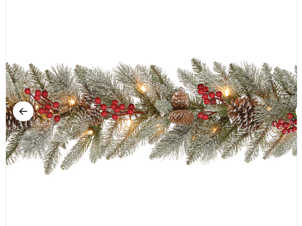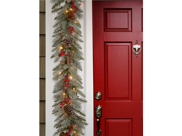This Snowy Bristle Berry garland features Feel Real branch tip technology, creating a decoration with remarkable realism. These crush-resistant branch tips are molded from real tree branches for an authentic appearance. This mixed evergreen tip garland has snow-dusted tips and is trimmed with red berries and pine cones. It is pre-lit with 50 clear lights that remain lit even if a bulb burns out. This garland can be displayed over doors, windows, fireplace mantels, fence, or stairway railings in indoor or covered outdoor locations.