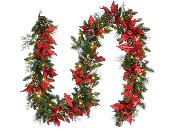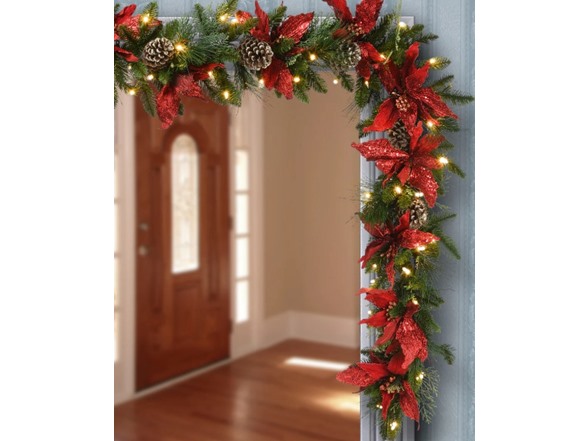 This Decorative Collection garland features Feel Real branch tip technology, creating a decoration with remarkable realism. Made to look and feel lifelike, the stunning realism of the tree is defined by its close attention to detail, featuring hundreds of individually crafted branch tips. It is trimmed with red glittered poinsettia flowers and gold glittered pine cones, and is pre-lit with 100 clear lights that remain lit even if a bulb burns out. This garland can be displayed over doors, windows, fireplace mantels, fence, or stairway railings in indoor or covered outdoor locations.