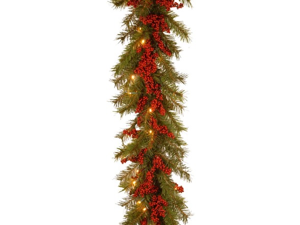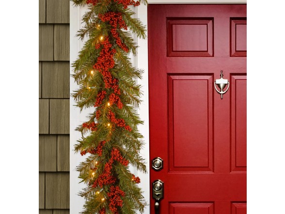 This Valley Pine garland is part of the Decorative Collection line of holiday decorating ideas. This thick green garland is trimmed with clusters of bright red berries. It is pre-lit with 50 battery operated warm white LED lights that are energy efficient and long lasting. Includes a 6 hours ON/18 hours OFF timed operation. This garland can be displayed over doors, windows, fireplace mantels, fence, or stairway railings in indoor or covered outdoor locations.