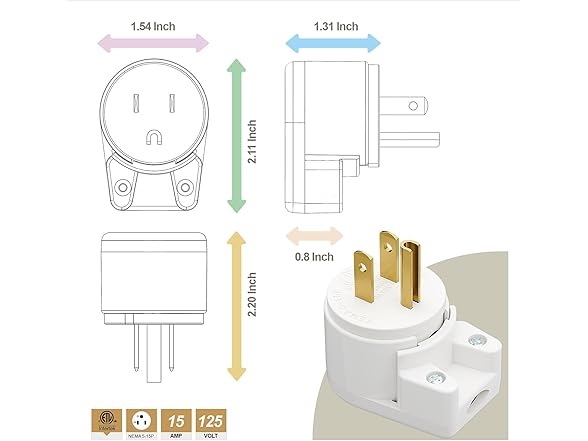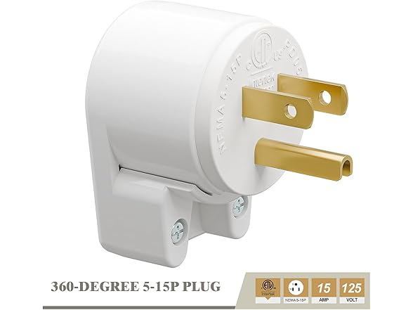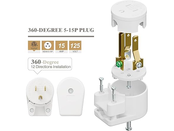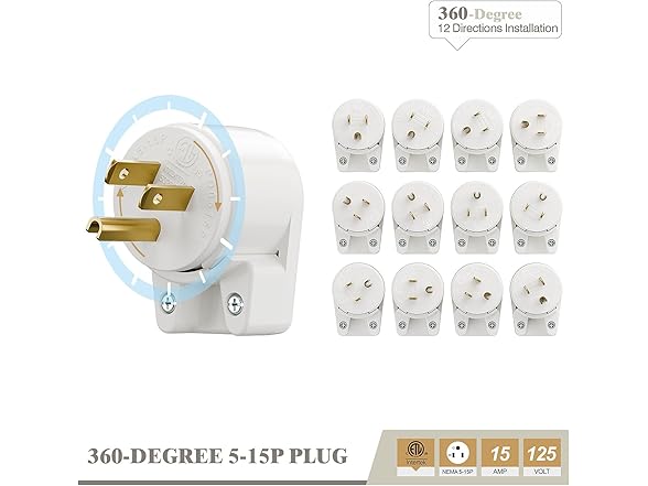 Right Angle Nema 5-15P 15A 125V AC Plug, [ETL] Easy Assembly 90 Degree USA Canada Male DIY Rewirable 12 Directions Adjustable AC Connector White AD0176