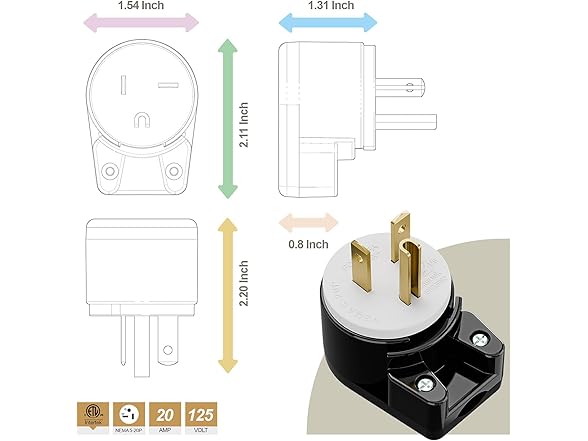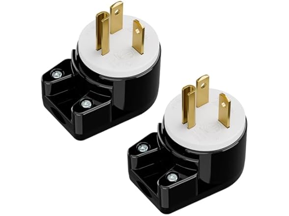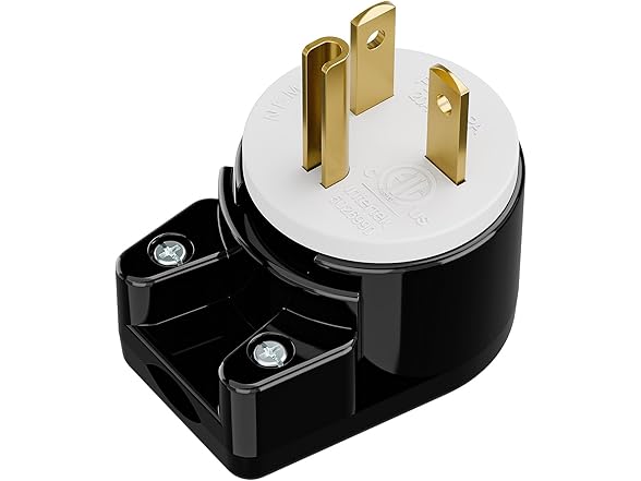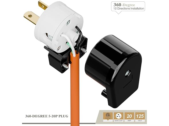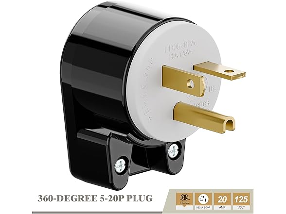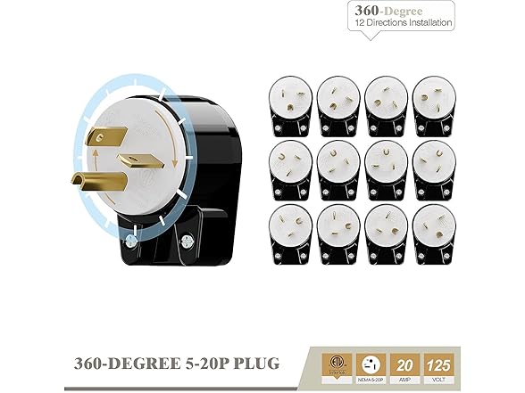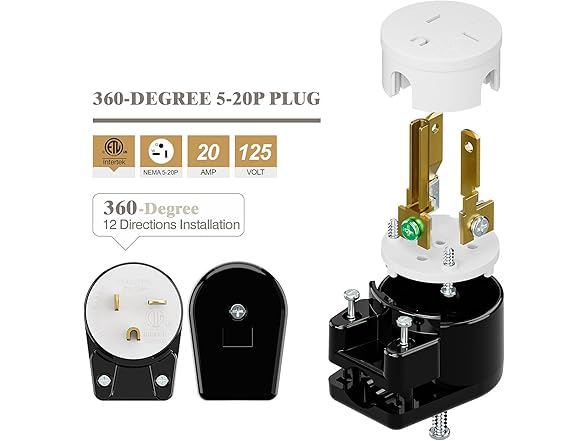 USA 3-Prong Male AC Plug, Right Angle ETL Nema 5-20P 3 Pole DIY Rewirable, 20A 125V USA 3Pin AC Connector, 12 Direction Rotatable Plug (2, Black/White)