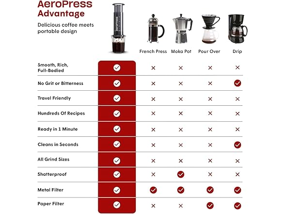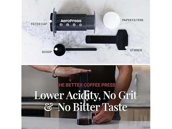 - BETTER THAN FRENCH PRESS: No more bitterness or grit. The patented 3 in 1 brew technology of the AeroPress Original Coffee maker eliminates bitterness and acidity and creates a smooth, rich, full bodied cup of coffee. Paper or metal micro-filters allow you to use finer ground coffee for a faster brew time and no grit (unlike the mesh filter of a French press). No more messy coffee grounds β clean-up takes seconds! Durable, shatterproof design, perfect for travel, camping & gifting.