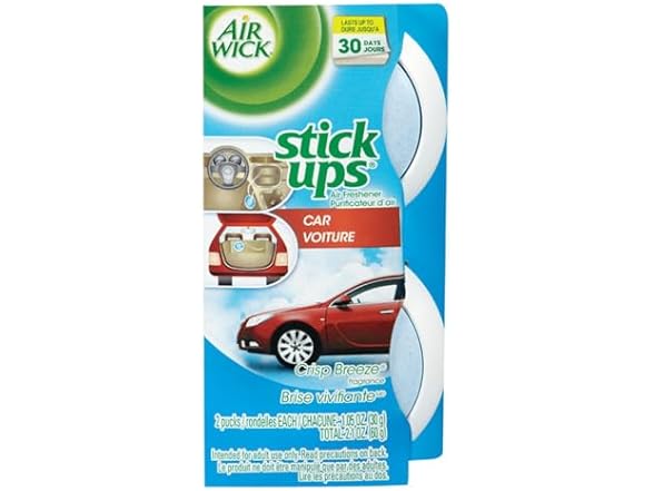 In the Box:- (1) Air Wick Stick Ups Car Air Freshener, Crisp Breeze (Packaging May Vary), 2ct