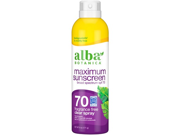 - Two 6 oz. aerosol can of Alba Botanica Maximum Fragrance Free SPF 70 Sunscreen Spray