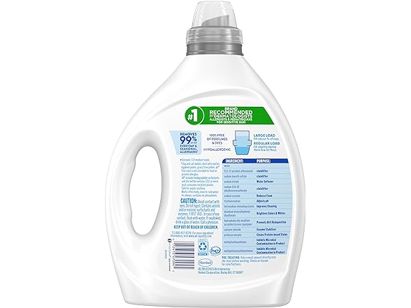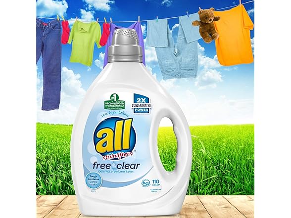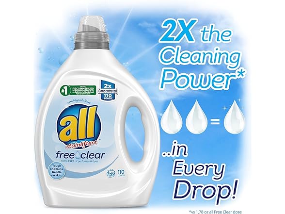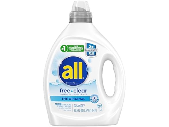 all Liquid Laundry Detergent, Free Clear for Sensitive Skin, Unscented and Hypoallergenic, 2X Concentrated, 110 Loads