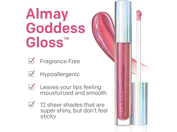 Almay Goddess Gloss transforms any lipstick with its sheer, layerable formula to create a dazzling effect. Can also be worn alone for a hypnotic iridescent sheen. Its flocked applicator provides a nice, even laydown of color every time. Available in 8 transcendent shades. Hypoallergenic. Ophthalmologist tested. Dermatologist tested. Almay - Quality ingredients. American science.