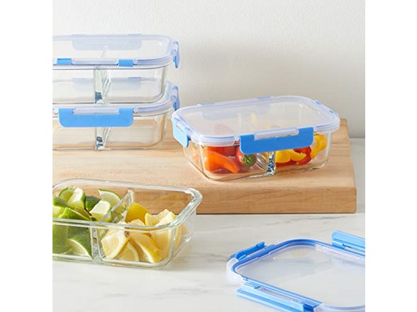 (1) Amazon Basics 2 Compartment Glass Meal Prep Containers, 36 ounces, 10-Piece Set, 5 Containers and 5 BPA-Free Lids, clear with blue silicone ring