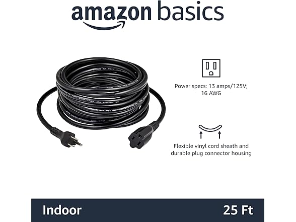 Amazon Basics Extension Cord, 13 Amps, 125V, 25 Foot, Black - Pack of 2