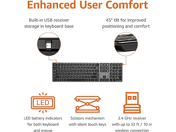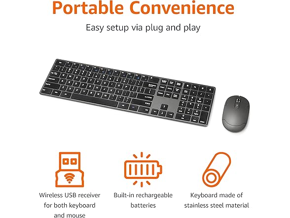 - QUIET AND COMFORTABLE KEYS: Experience the quiet wireless keyboard and mouse combo with low-profile, comfortable keys paired with a durable stainless steel housing for a convenient typing experience