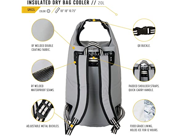 - BUILT FOR THE OUTDOORS: Constructed with quality RF welded seams, zipper-less closure and PEVA lining, this cooler bag is abrasion resistant, buoyant, durable and high performance