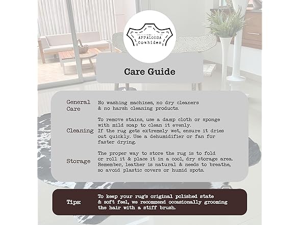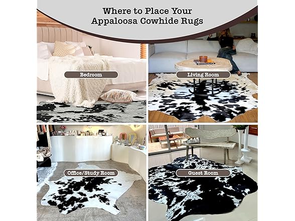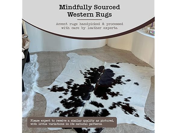 • Timeless Animal Hide Rugs by Appaloosa: With over 25 years of experience working with leather, we strive to honor nature while providing mindfully sourced, exceptional-quality rugs for your home so you can unwind in style. Expect similar quality as pictured, with possible little variations in natural cowhide patterns.