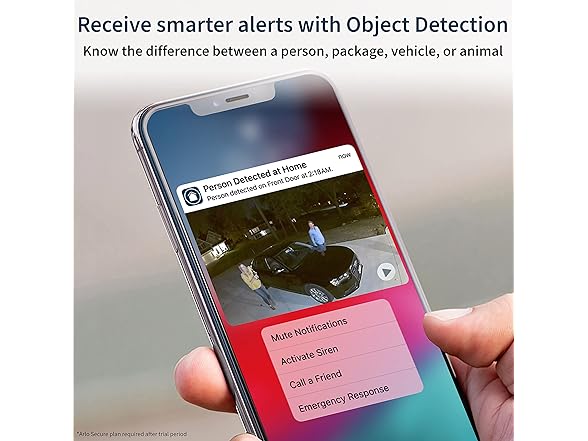 - Smarter alerts, quicker action - With an Arlo Secure plan, receive smarter notifications for people, vehicles, packages, and animals so you can react quickly, right from your phone’s lock screen.