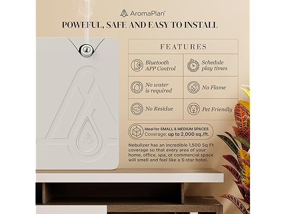 - AMAZING FRAGRANCE IN EVERY CORNER: The AromaPlan nebulizer has an incredible 1,500 Sq Ft coverage so that every area of your home, office, spa or commercial space will smell and feel like a 5-star hotel. The AromaPlan diffuser system is very user-friendly, with automatic and App control that you can schedule according to your daily needs and never waste your favorite scent again!