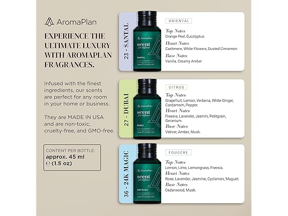 - SAFE AND ECO-FRIENDLY - The AromaPlan fragrance oil is completely safe for PETS AND CHILDREN, so you can enjoy all the wonderful benefits of our perfumes without any worries. Our aromatic oils are non-flammable and environmentally friendly.